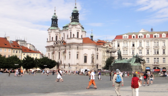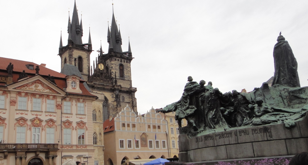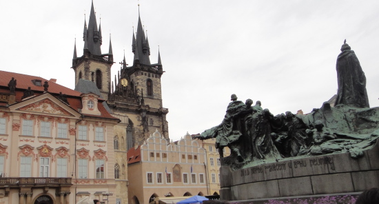 広場の中心には、自らにおける信念のためドイツのコンスタンツで火あぶりの刑に処せられた宗教改革者ヤン・フスの銅像があります。 |
