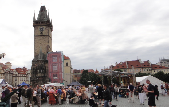 プラハ観光の中心地であり、多くの観光客や大道芸人で賑わっています。広場には旧市庁舎、ティーン教会、ヤン・フス像など、歴史的な建造物や見どころが多数あります。 |