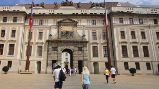 門の上部には、ハプスブルク家の紋章が飾られています。この門をくぐると、プラハ城の歴史的な建物や広場へと続いていきます。 |