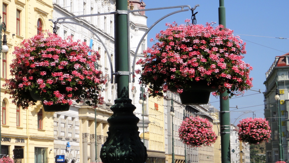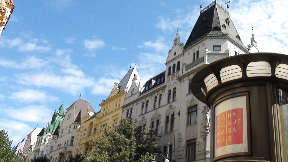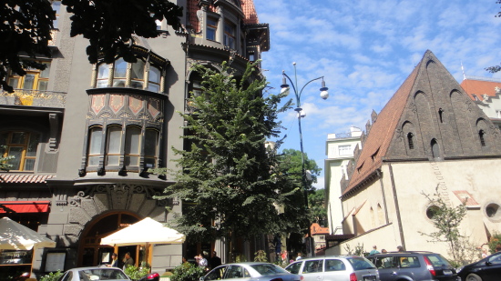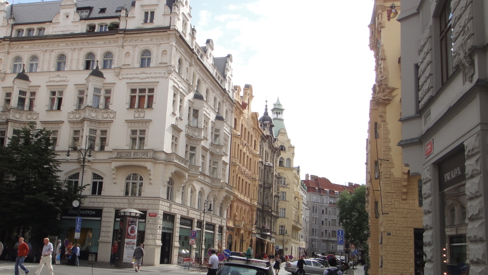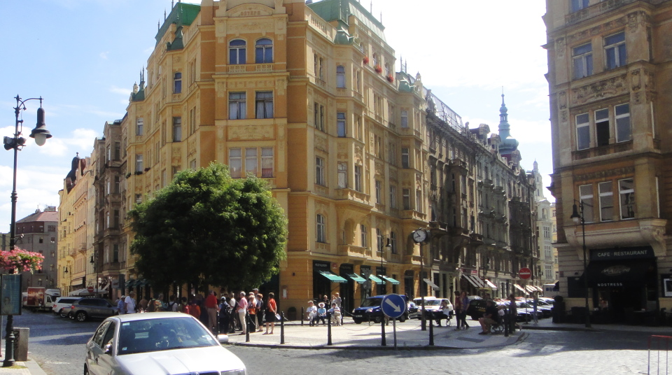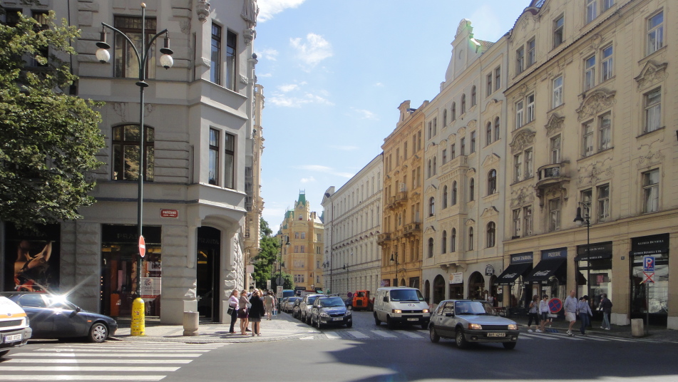 44.パリ通り「パジージュスカー通りとシロカー通り交差点」 旧市街広場からユダヤ人地区へと続く通りです。街路樹が並び、周囲の建物はパリの街並みのような豪華な外観が見ものです。
