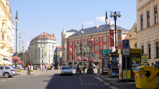左側の建物は「ホテル キングス コート」です。右側の白い外観に赤い屋根の建物はコネクター・プレイス「Konektor Place」と呼ばれ、ČSOB銀行の支店などが入居しています。