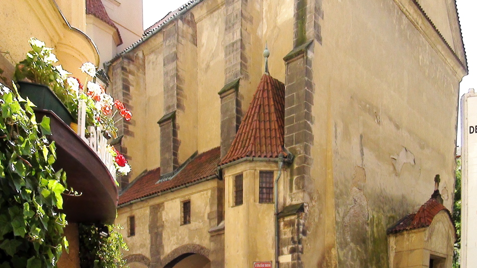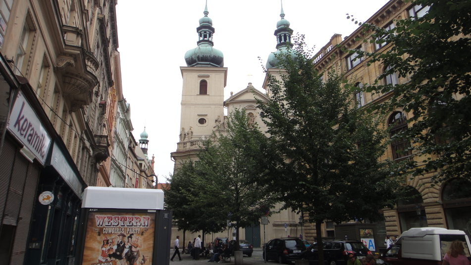 この教会は14世紀半ばに建てられたゴシック様式の教会で、1689年の火災後に再建され、ゴシック様式とバロック様式が混在する建築となりました。教会のすぐ右側には、作家フランツ・カフカの記念碑があります。