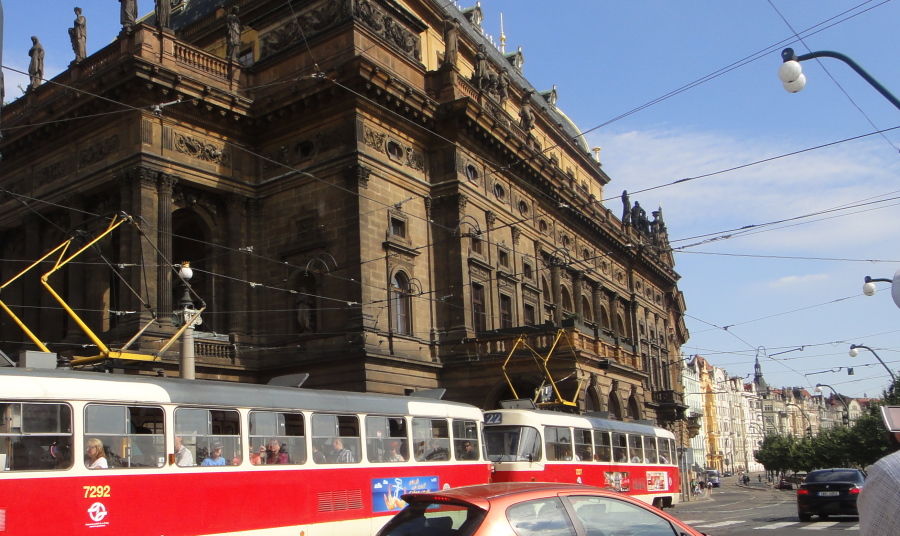 手前を走っている赤い路面電車は、プラハ市電で広く使用されているタトラT3型です。