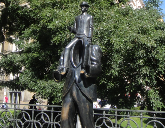 彫刻家ヤロスラフ・ロナ(Jaroslav Róna)によって2003年に制作されたブロンズ像です。高さ3.75メートルの像で、巨大な「空っぽのスーツ」の肩に小さなカフカがまたがっているユニークな姿をしています。