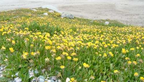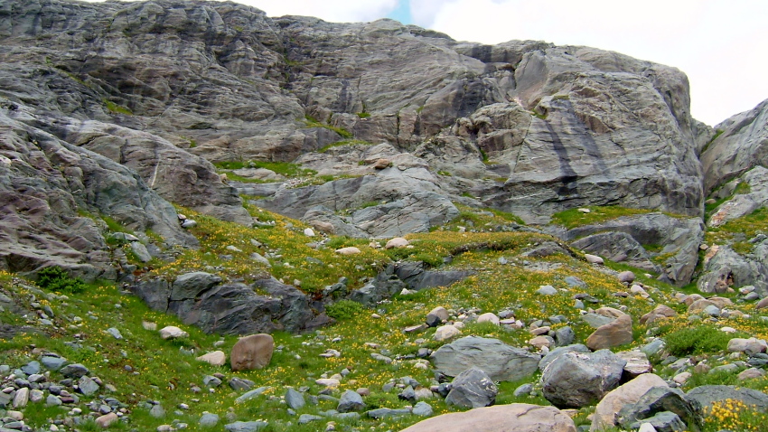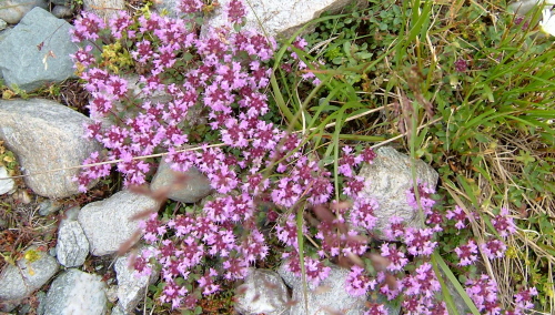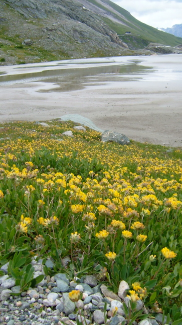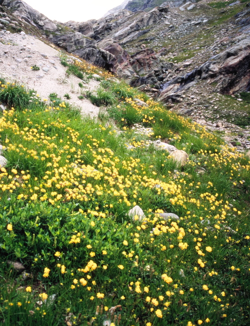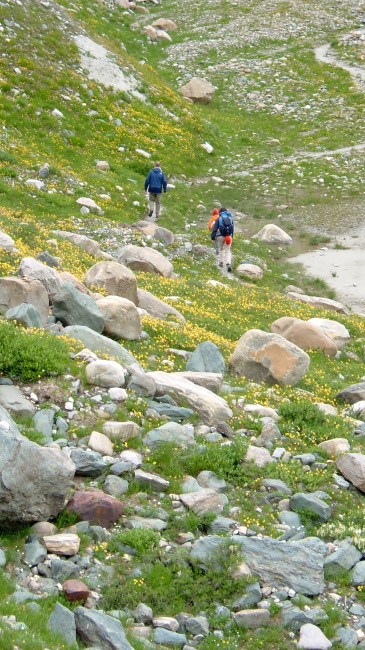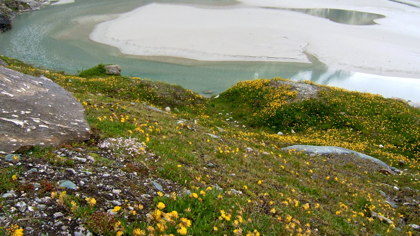 氷河の溶け出した水の流れに沿って降りてゆくと氷河の水を集めたサンダー湖に着きます。あたりは一面の高山植物に覆われており、花の絨毯のようです。