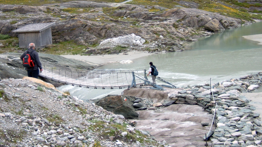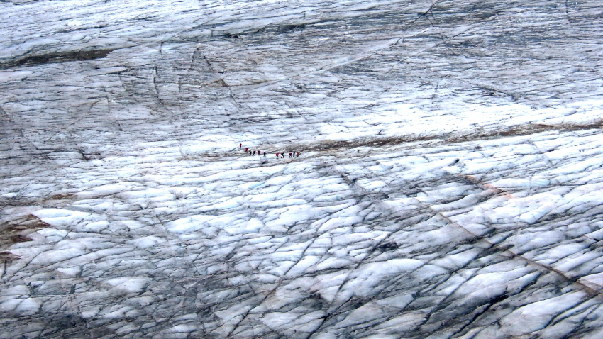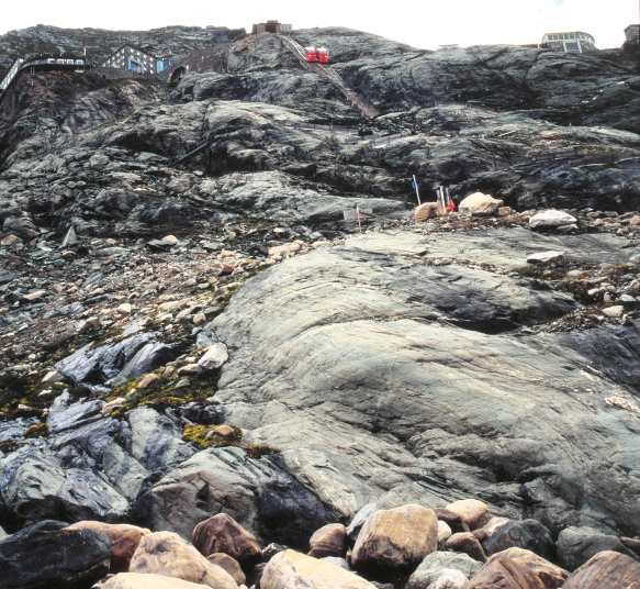 私達はケーブルカーから降りた後少し降りたところより左側に曲がるトレッキング・コースを降りてゆきます。以前は氷河の先端を歩くコースのようでしたが、氷河が後退したのでしょう、今では殆ど氷河の上を歩かずに、コースを進むことが出来ました。