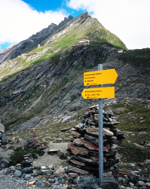 展望台の建物の横よりホフマンスヒュッテHofmannshutte(2444m)までの登山道が有りますヒュッテまでは2.5kmです。殆ど平坦な道です。パステルツェ氷河を間じかに、グロースグロックナーを真正面に見ながらハイキング気分で歩けますのでお勧めコースです。