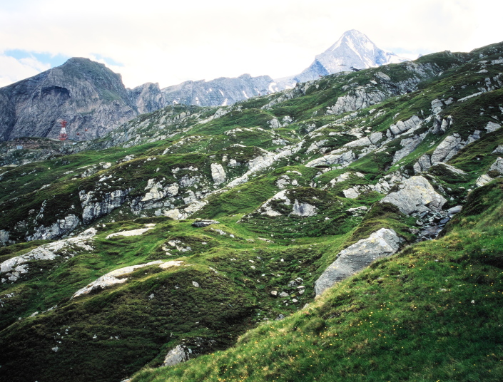今回のトレッキング・コースは、U字谷の山腹をトラバースして麓近くのヒュッテまで行くコースです。距離も長く、痩せ尾根を通過するなどスリルも有りますが、氷河をまとったキッツシュタインホルンを眺めながらの稜線歩きはまるでスカイラインのウオーキングのようです。