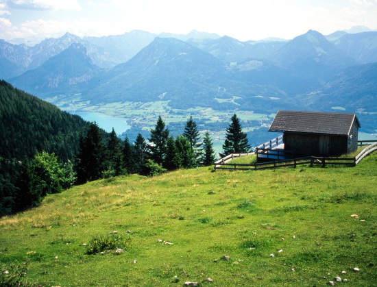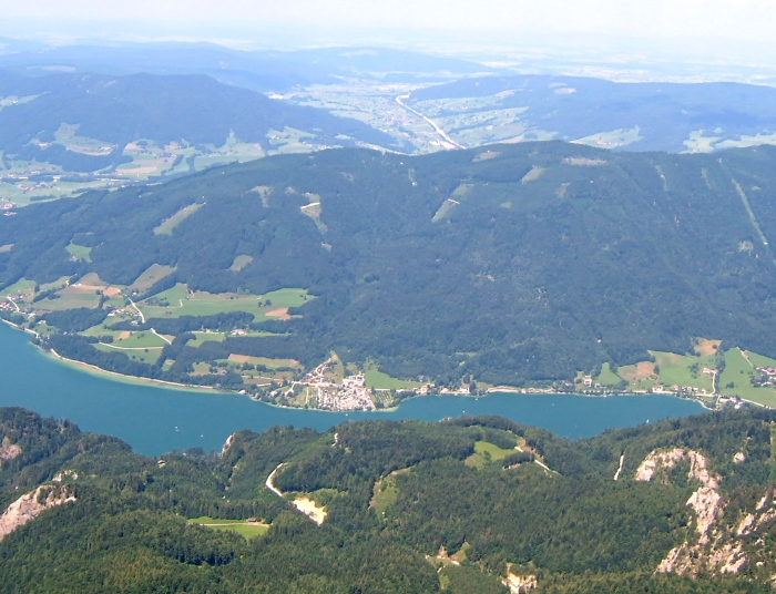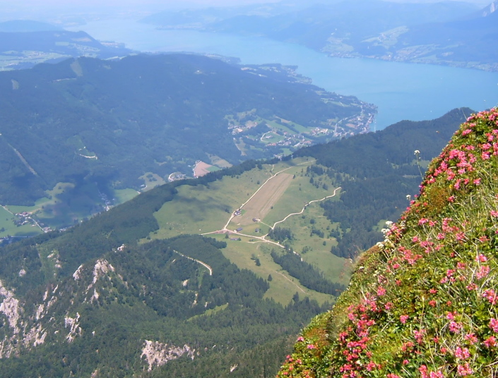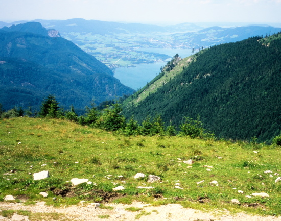 柵沿いに見渡すと、周囲の山々に囲まれるようにザルツカンマーグートの湖水がキラキラと輝いて見えます。眼下にはモントゼーMondseeが、更に北東方向にはアッターゼーAtterseeが見えます。