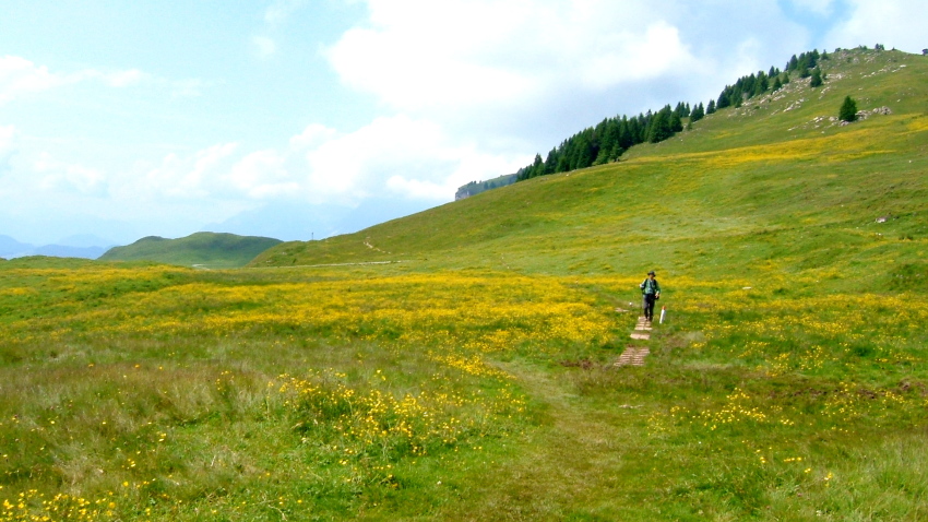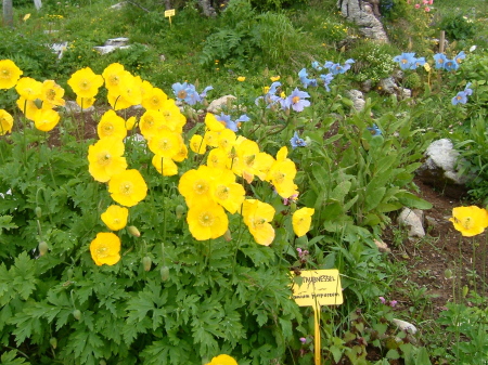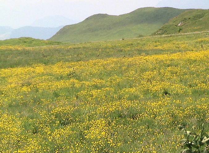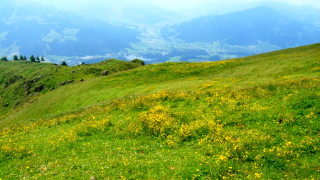 ハイキングコースは、なだらかな草原で、沢山の高山植物が高原一杯に咲いており、「花の絨毯」の言葉どおりです。高原一面が花の色(黄色)で塗りつぶされています。遠くに、ホーエ・タウエルンHohe