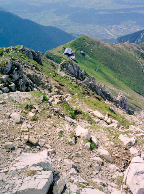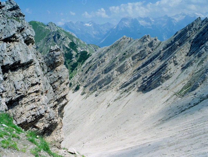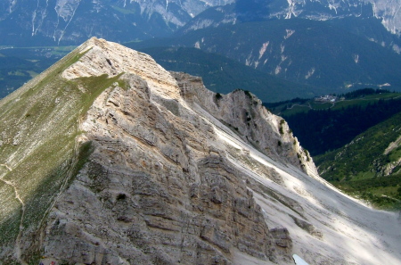 途中鞍部があり、そこから二又にルートが分かれます。右に進路をとると岩稜と砂の混じった急斜面をトラバースし、ゼーフェルダーシュピッツェSeefelderSpitze(2221m)に行きます。左に進路をとると、もと来たヘルメレコプフHarmelekopf(2050m)です。