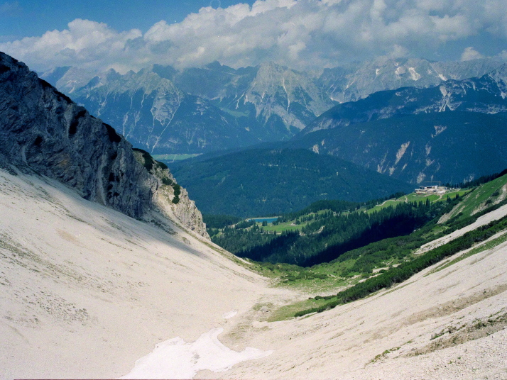 北側ドイツ国境には、ドイツとオーストリアを分けるヴェッターシュタインWettersteinwandが屏風のようにそそり立って見えます。