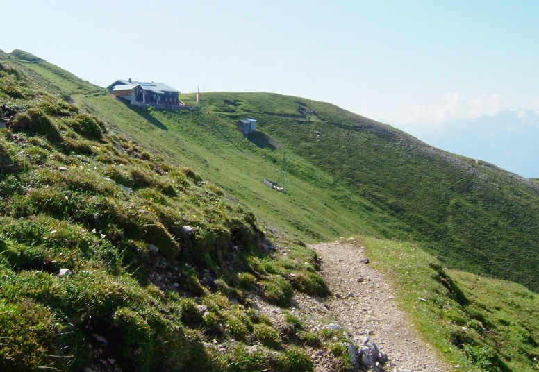 コースは、展望台までケーブルカーとゴンドラリフトで登ります。ケーブルカーの終点駅ロスヒュッテRosshutte(1751m)より、ゴンドラリフトで右尾根に有るヘルメレコプフHarmelekopf(2050m)に向かいます。ヘルメレコプフHarmelekopf(2050m)展望台の眺望を楽しんだらライターシュピッツェReitherspitze(2374m)の山頂を右側から巻きながら登ってゆくとネルトゥリンガーヒュッテNordlinger Hutte(2239m)に到着です。