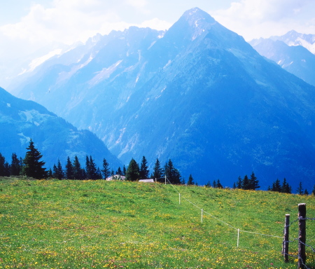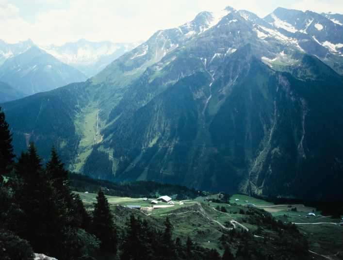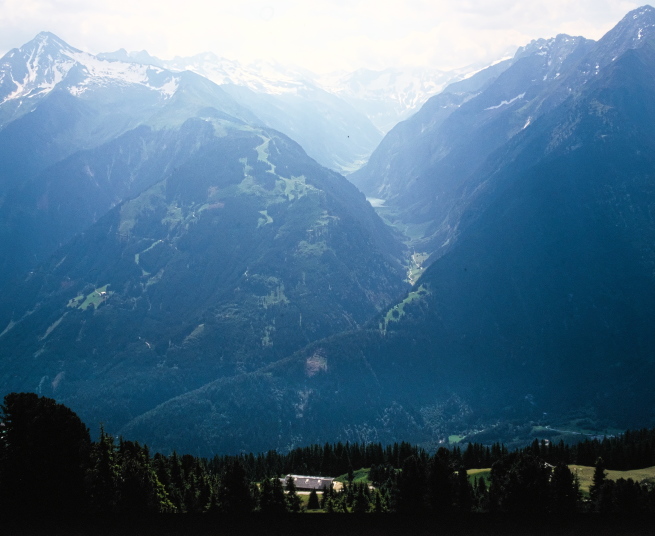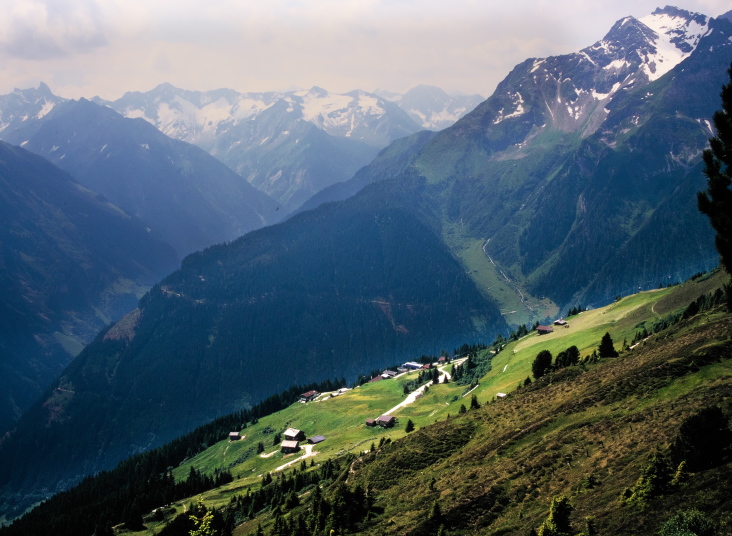 マイアーホーフェンの奥は4つの細い谷に分かれており、その先は3000m級の山が聳えるツィラーターラー・アルペンです。
