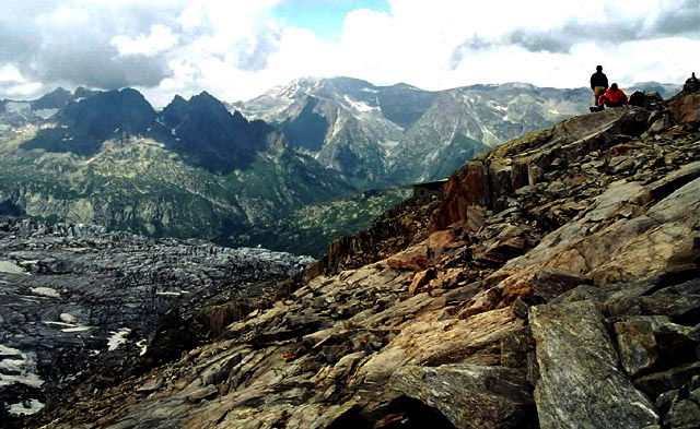 氷河の上にヴェルト針峰、ドリュの頭が見えます。