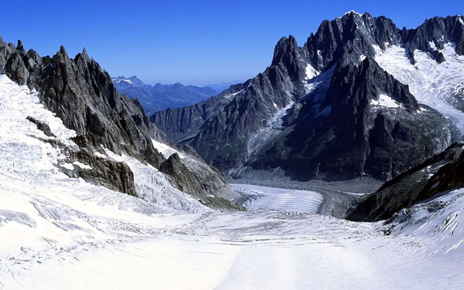 正面上流の氷河はGeant Glacier、Tacul Glacier 下流はMerde Glace。正面右がわの飛び出ている山が、ドリュ Les Drus(3412m)、 その右の大きな山がヴェルト Aiguille Verte(4122m)
