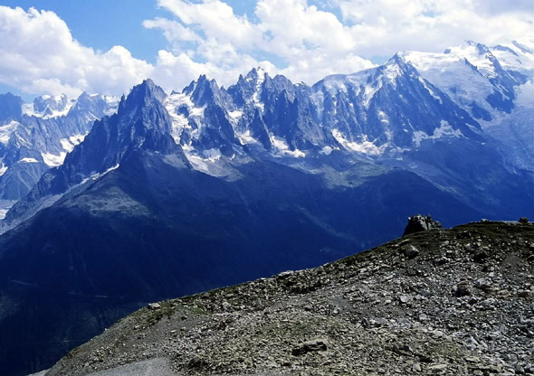 画面右上部に氷河のある山が見えます。氷河の左端のピークはMont Maudit 4465m。その直下の三角垂の山の戴きがAiguille Du midi。 隣の氷河の戴き(Vの字型の岩に囲まれている氷河)がMont Blanc Du Tacul 4248M。その右横がモンブラン(4807m)ですが、頂きは丁度画面から切れて見えません。 NO1の右方向を撮った画像です。