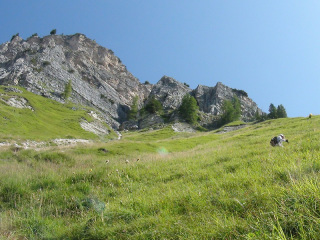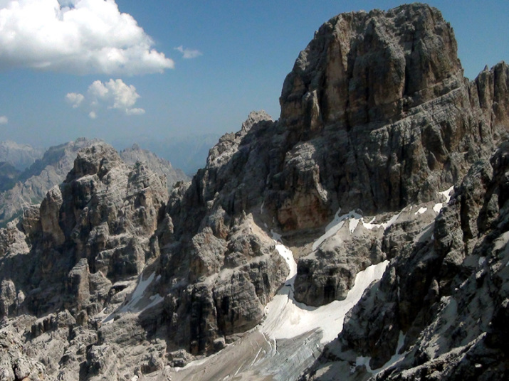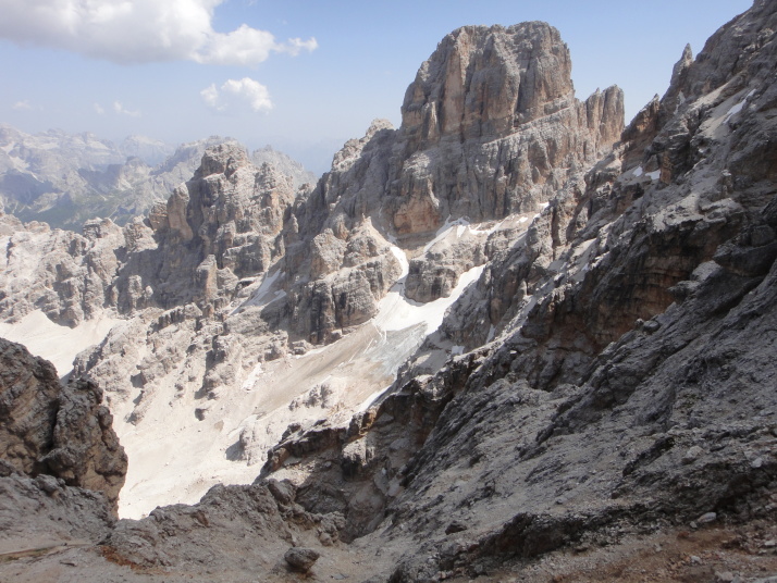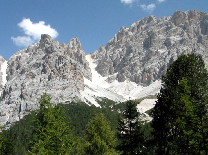 鞍部でしばらく休憩です。眼の前には、クリスタッロCristaallo(3221m)の山塊が荒々しい岩肌をむき出しています。 |