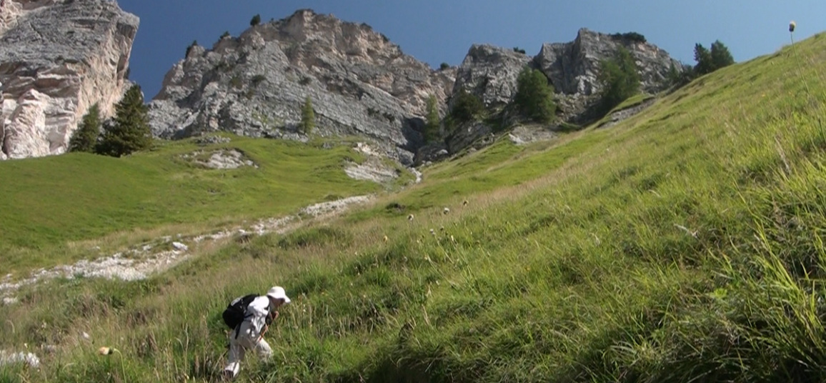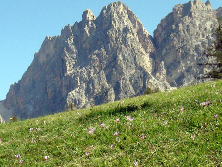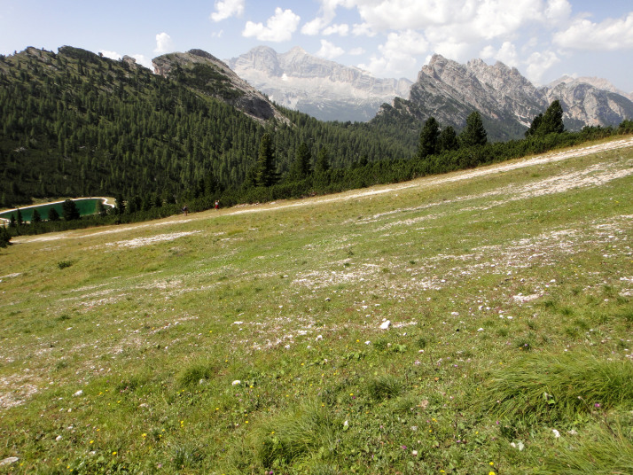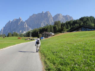 後ろを振り返るとコルティナ・ダンペッツオの街越しにトファーナTofana(3244m) ファローリアFaloria (2331m)がパノラマのように広がって見えます。 |