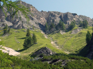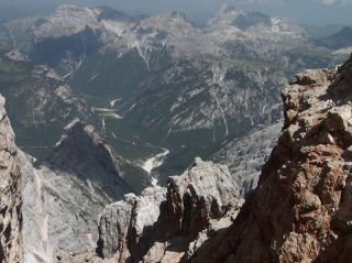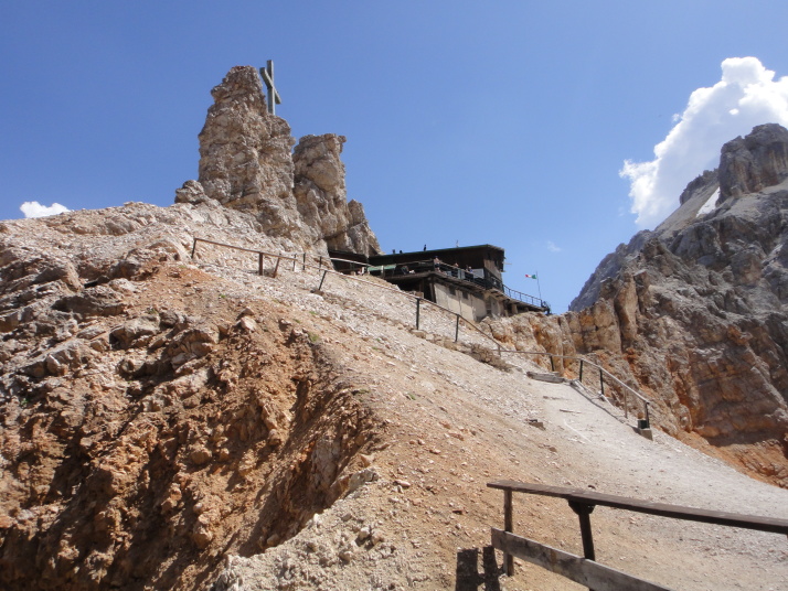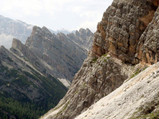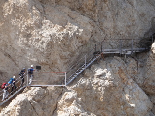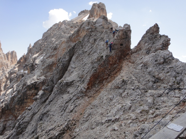 ここから山頂へ向け、「ヴィア・フェツラータ」と呼ばれる鉄のロープや梯子を使いながら岩肌を進む、難易度の高いコースに挑戦している人がいます。 |