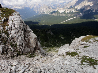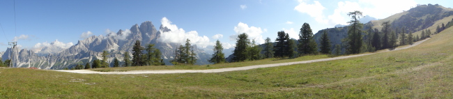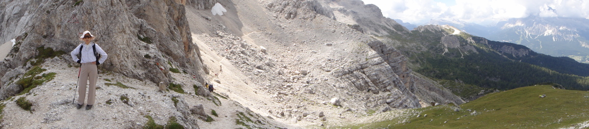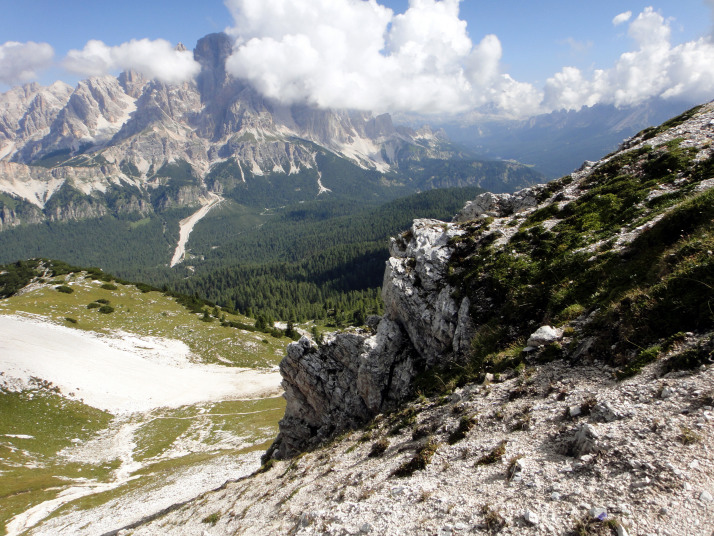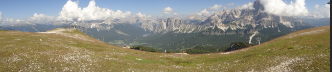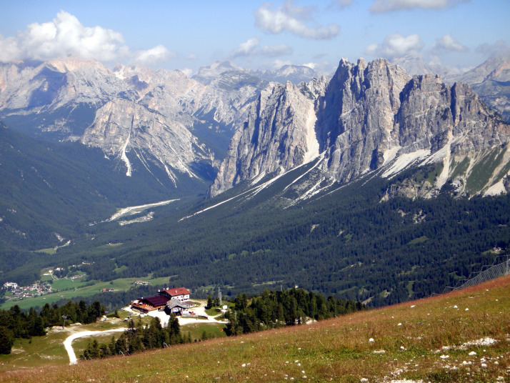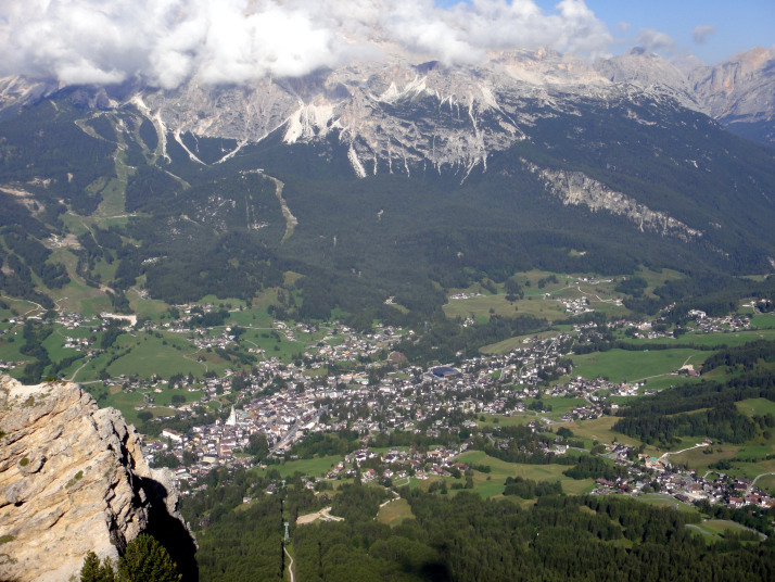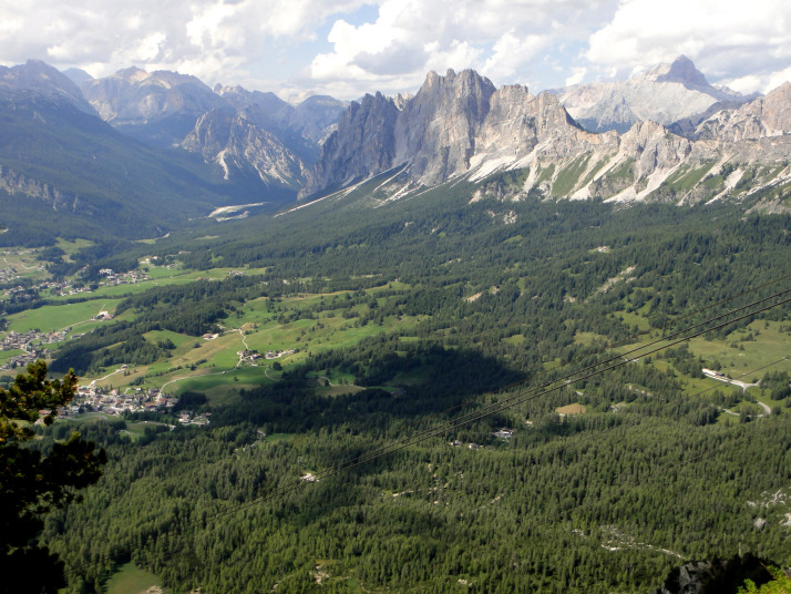 コルティナ・ダンペッツオの市街が眼下に小さくなってゆきます。谷を隔てて西正面にトファーナの山塊が見えます。 |