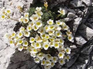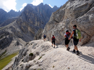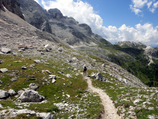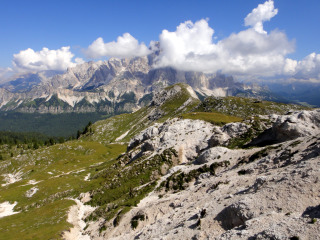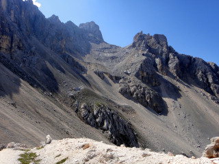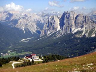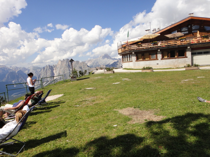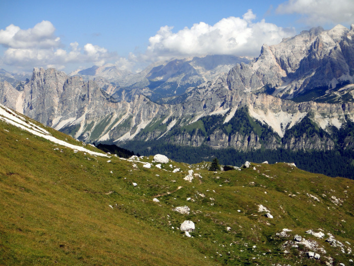 フォローリア小屋Rifugio Faloria(2123m)フォローリア小屋周辺は、草付きとなっていますが、草付きが広がる西側(手前方向)は、徐々に傾斜が強くなっています。 |