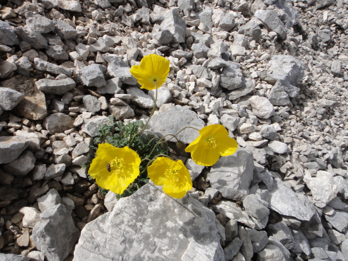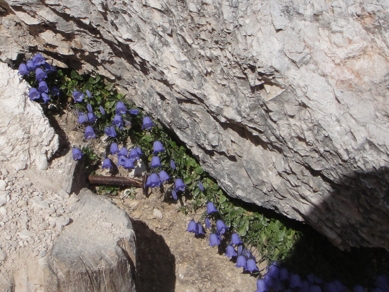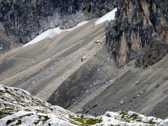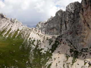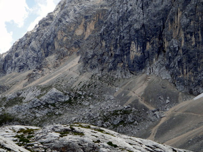 垂直の岩場とザレ場の境のルートを歩いて行きます。 |