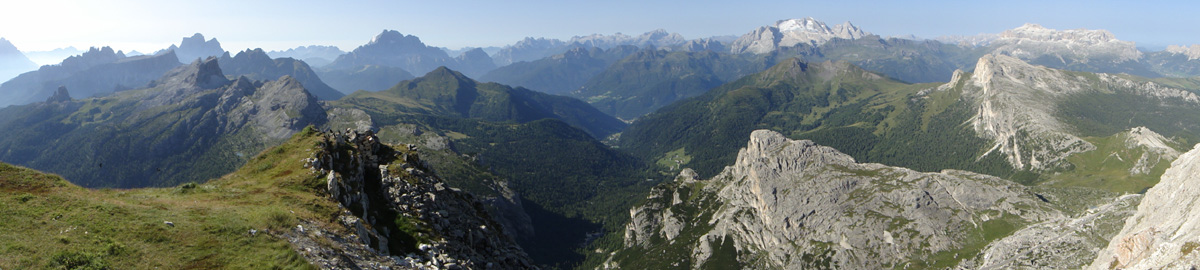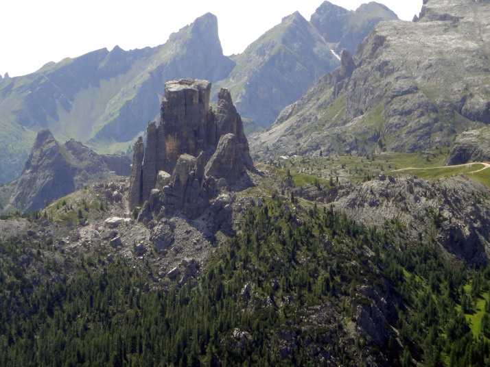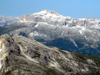 巨大な尖塔を持つ名峰チベッタ山(Monte Civetta3218m)が南方向に遠くかすんで見えます。 |