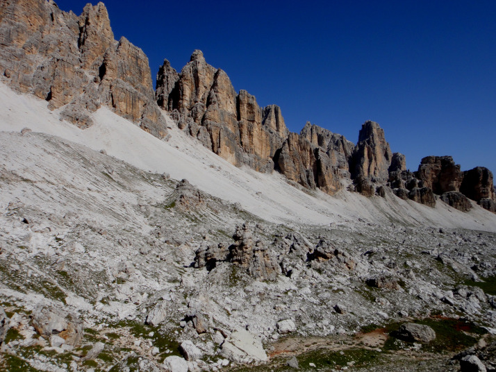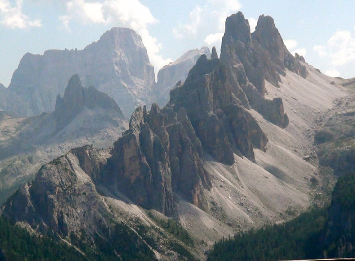 左側、奥の頂きはソラピス(Punta Sorapis 3205m)、その右端はアンテラオ(Monte Antelao 3263m)です。