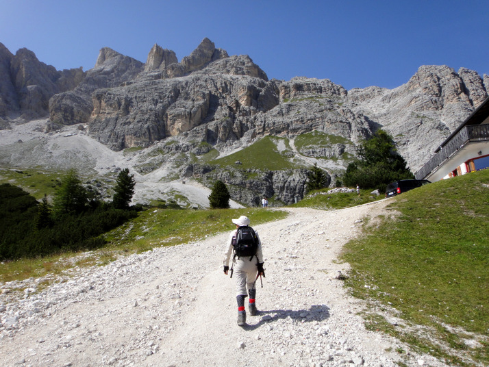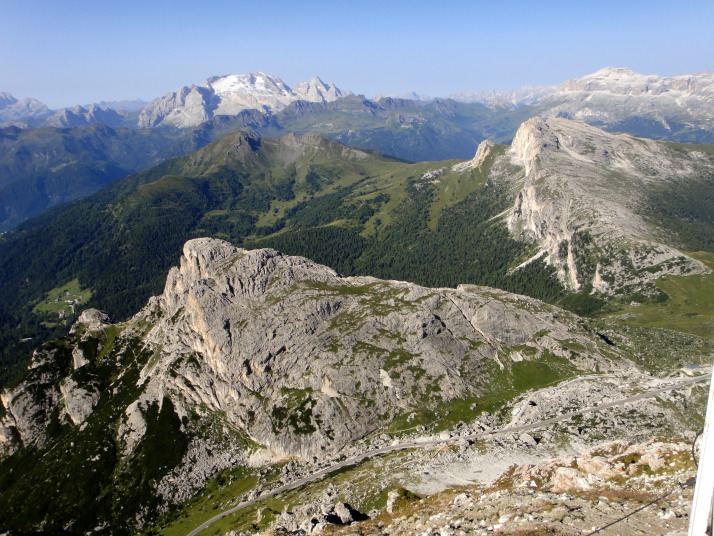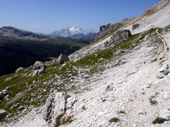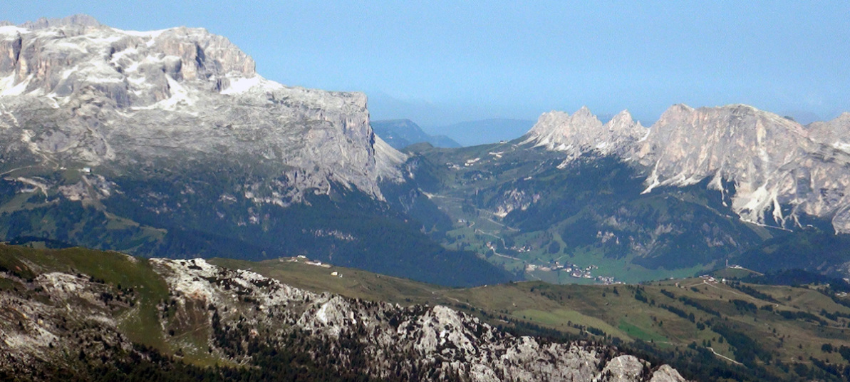 遠くにモンテ・ペルモ(Monte Pelmo3168m)が見えます。中央の霞んで見える山。
