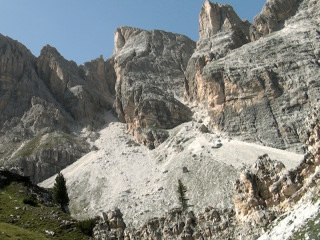 山側はトファーナ・ディ・ローゼ(TOFANA DE ROZES3225m)の垂直な岩壁が屏風のように迫っています。 |
