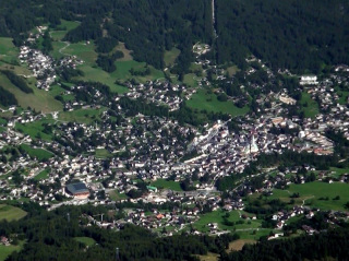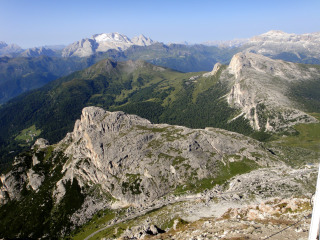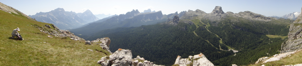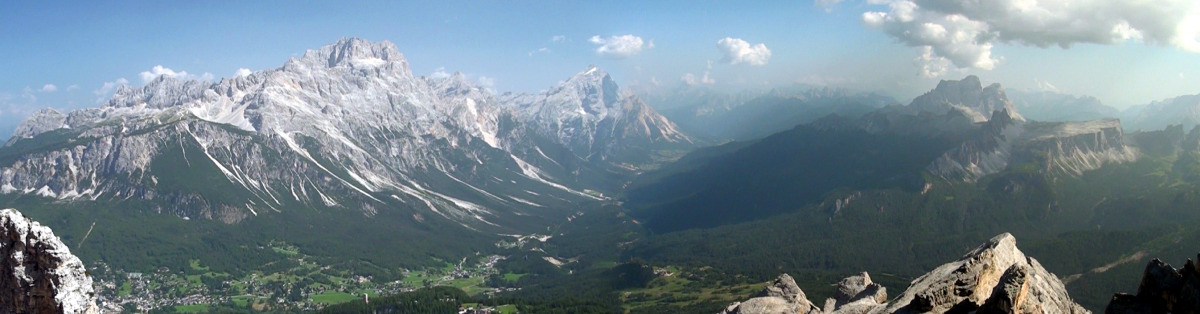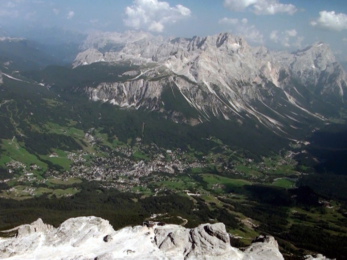 フォローリアFALORIA(2331m)後方はソラピス(Punta Sorapis 3205m)の山塊、右側にアンテラオ(Monte Antelao 3263m)が見えます。眼下は、コルティナ・ダンペッツオの街。 |