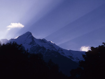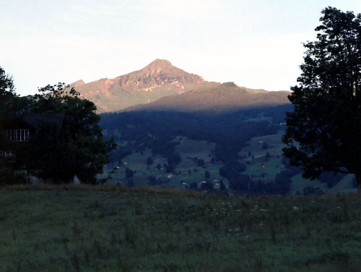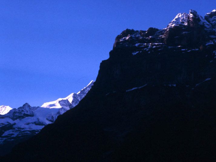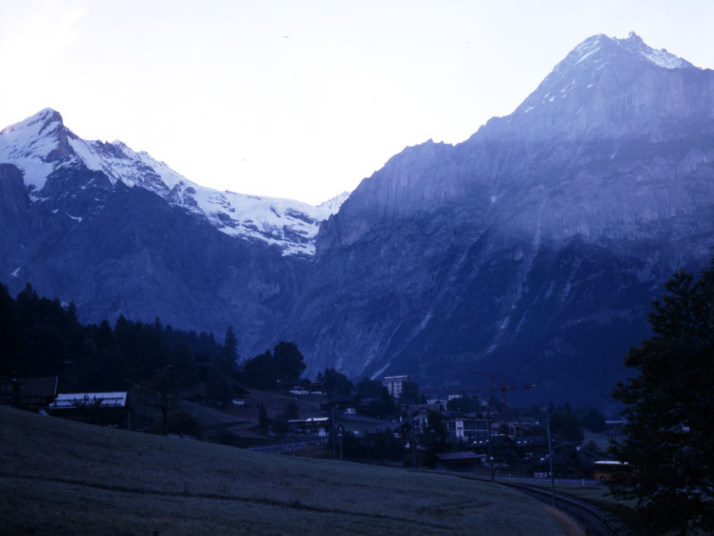 グリンデルワルトの朝。左よりヴェッターホルン (Wetterhorn3701M)、ミッテルホルン(Mittelhorn3704)、ローゼンホルン(Rosenhorn3689M)後方からあさひが、山々の稜線にあたり放射線状の陰影を見せています。