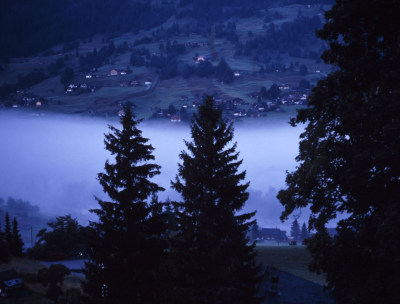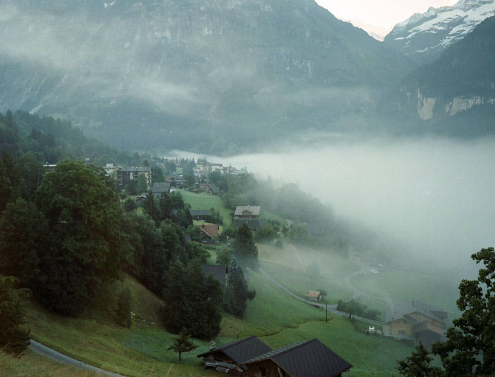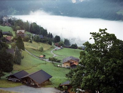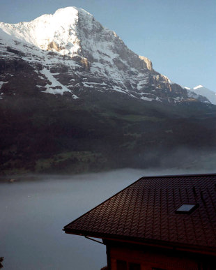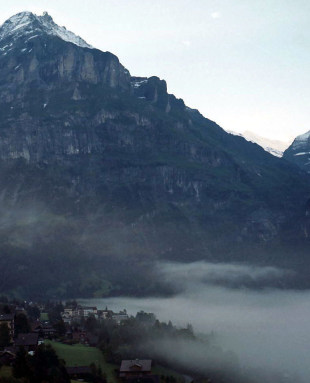 グリンデルワルドの朝 朝霧の中にグリンデルワルドの村が遠望出来ます。