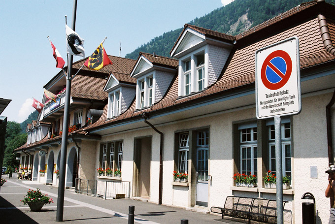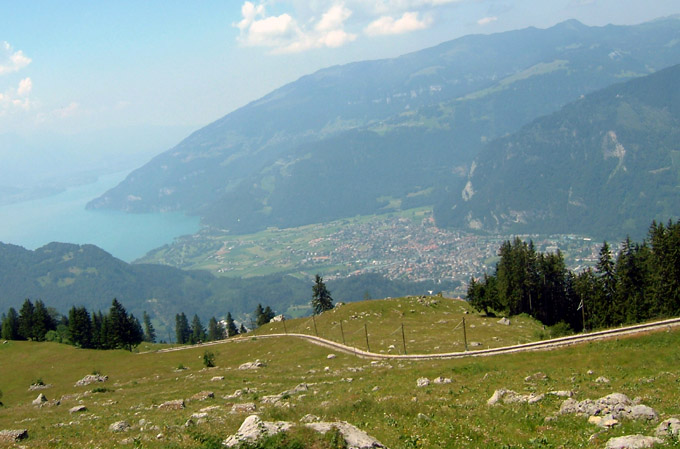 暫く森の中を通って行きますが、中間駅を過ぎる頃、視界が急に開け、トゥーン湖、インターラーケンの町が眼下に見られるようになります。 |