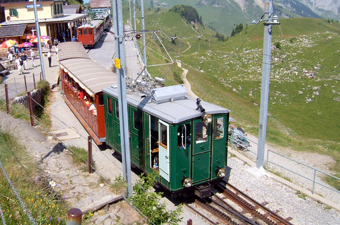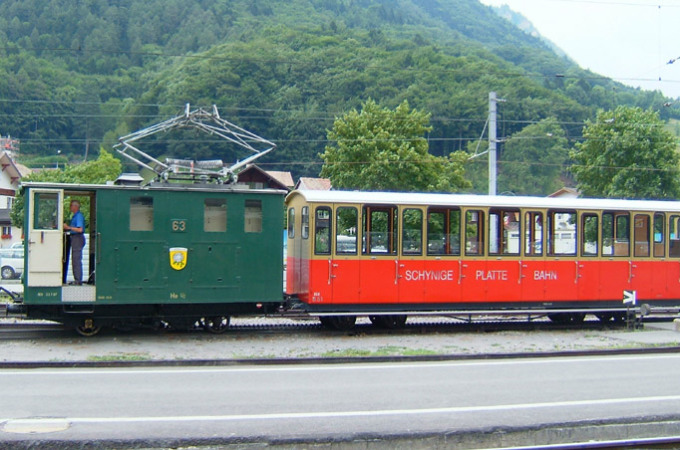インターラーケンからグリンデルワルトへ行きの列車(私鉄BOB)に乗り隣駅のビルダースヴィルで降りると、駅前にシニーゲプラッテ行きの登山鉄道SPBが待っている。