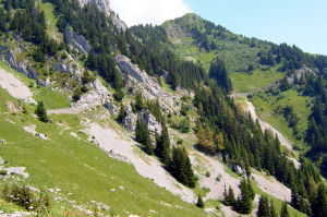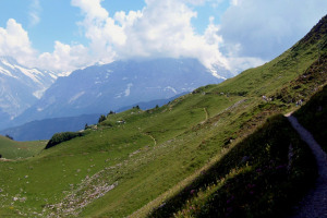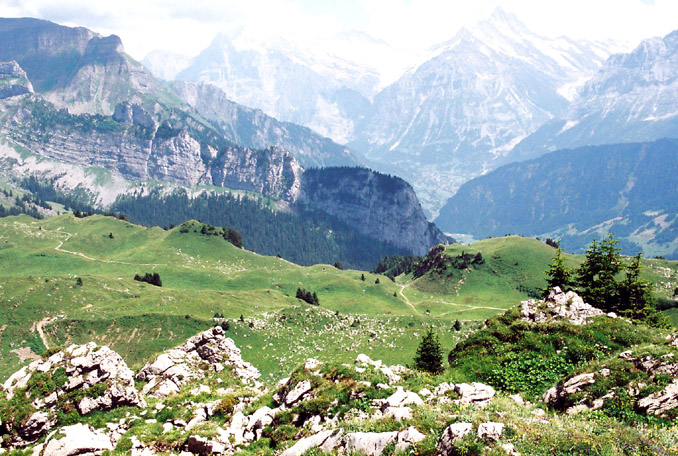 電車は急角度の山道を登り稜線を過ぎると右手方向にベルナーオーバラント三山を中心とした山々が見えてきます。