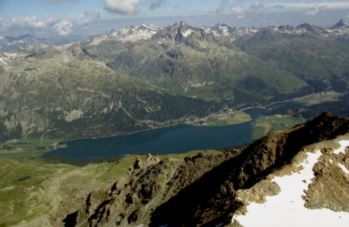 ゴルヴァッチュ(P.Corvatsch 3,297m)展望台より北側シルヴァプラーナ湖(silvaplanasee)の眺望。