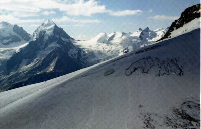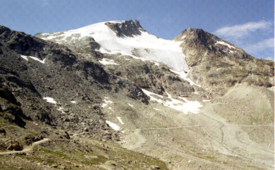 右の氷河は、ロゼック氷河(Vadret da Roseg 3920m)と呼ばれておりこの氷河は、これからトレッキングするロゼック谷に流れ、ポント・レジーナ(Pontresina)に至ります。 |