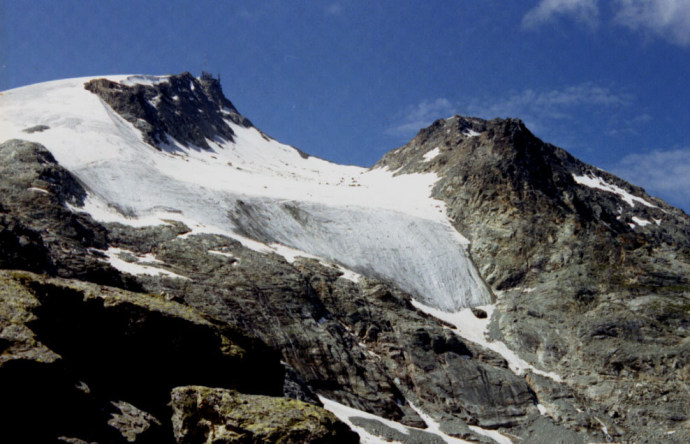 正面の三角型の山は、Piz Roseg(2,770m)です。この山の左側の氷河は、チエルヴァ氷河(Vadret da Tschieroa)です。