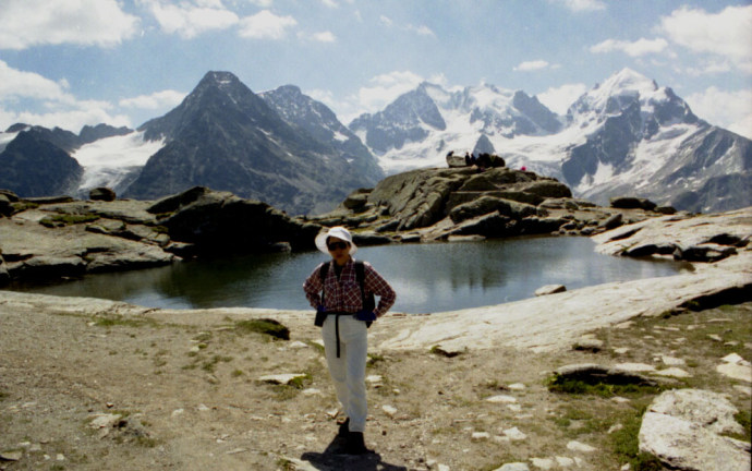ガレ場をトラバースし、一登りすると急に眺望が開け、ロゼック谷を隔てベルニナ山群が忽然と姿を現わします。ベルニナ山群の核心部が見えて来ます。