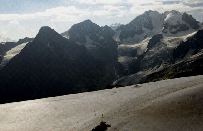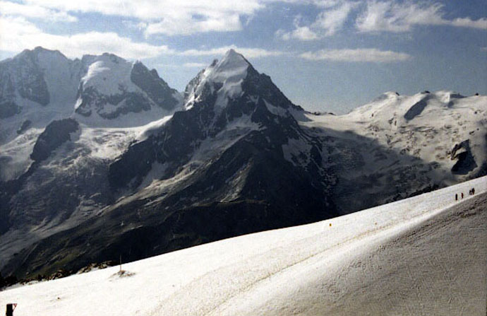 右から三角錐の山がピッツ・ロゼックその隣後方に、ピツツ・シエルセン(Piz.Scerscen3895m)そしてピッツ・ベルニナ(P.Bernina)(4049m)と続きます。