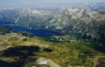 シルス(Sgel)湖を北西(画面左)の方向に上って行くと、マロヤ(Maloya)峠があります。峠を超すとブルガリア峡谷(Val Bregaglia)です。ブルガリア峡谷は、中世の面影を残した村ソーリオ(Soglio)があります。 |