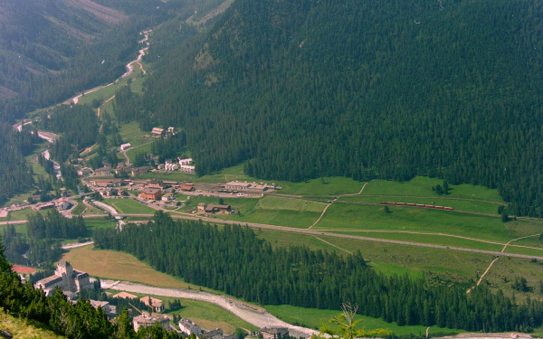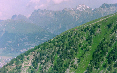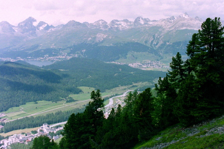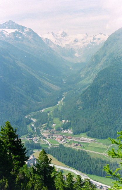 ポントレジーナ(Pontresina)の村越しに、ロゼック谷を正面眼下に見渡せます。
