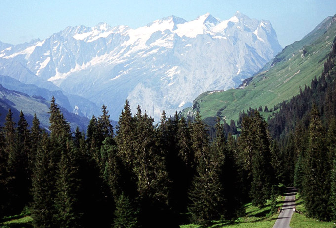 ゲンタールGental谷を登って行くと後方にベルナーオーバラントの山々が見えます。