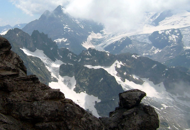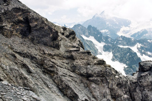写真右よりヴェッターホルンWetterhorn3692m)、ミッテルホルンMittrlhorn(3704m)ローゼンホルンRosenhorn(3689m)が見えます。