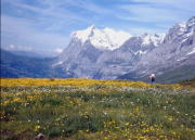 アイガー(3,970m)、メンヒ(4,099m)、ユングフラウ(4,158m)などの名峰を有 するこの山群は、明るく広がる牧草地と氷河を頂き、ヨーロツパアルプスの代名詞と呼んでも良い地域です。