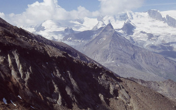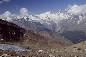 右よりナーデルホルンNadelhorn4327m、レンツシュピッツェLenzspitze4294m、ドームDom(4545m)テッシュホルンTaschhorn(4491m)の高峰が見えます。