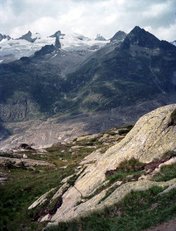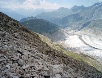 ベルナー・オーバーランドの山を見る時、一般的にはグリンデルワルト方向(北側)から望みます。アレッチ地域はその反対側(南側)に位置する地域で、ローヌ谷の上流部の尾根筋と中腹部の総称です。